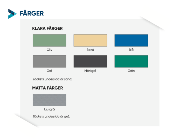 Oliv, Sand, Blå, Grå, Mörggrå och Grön.